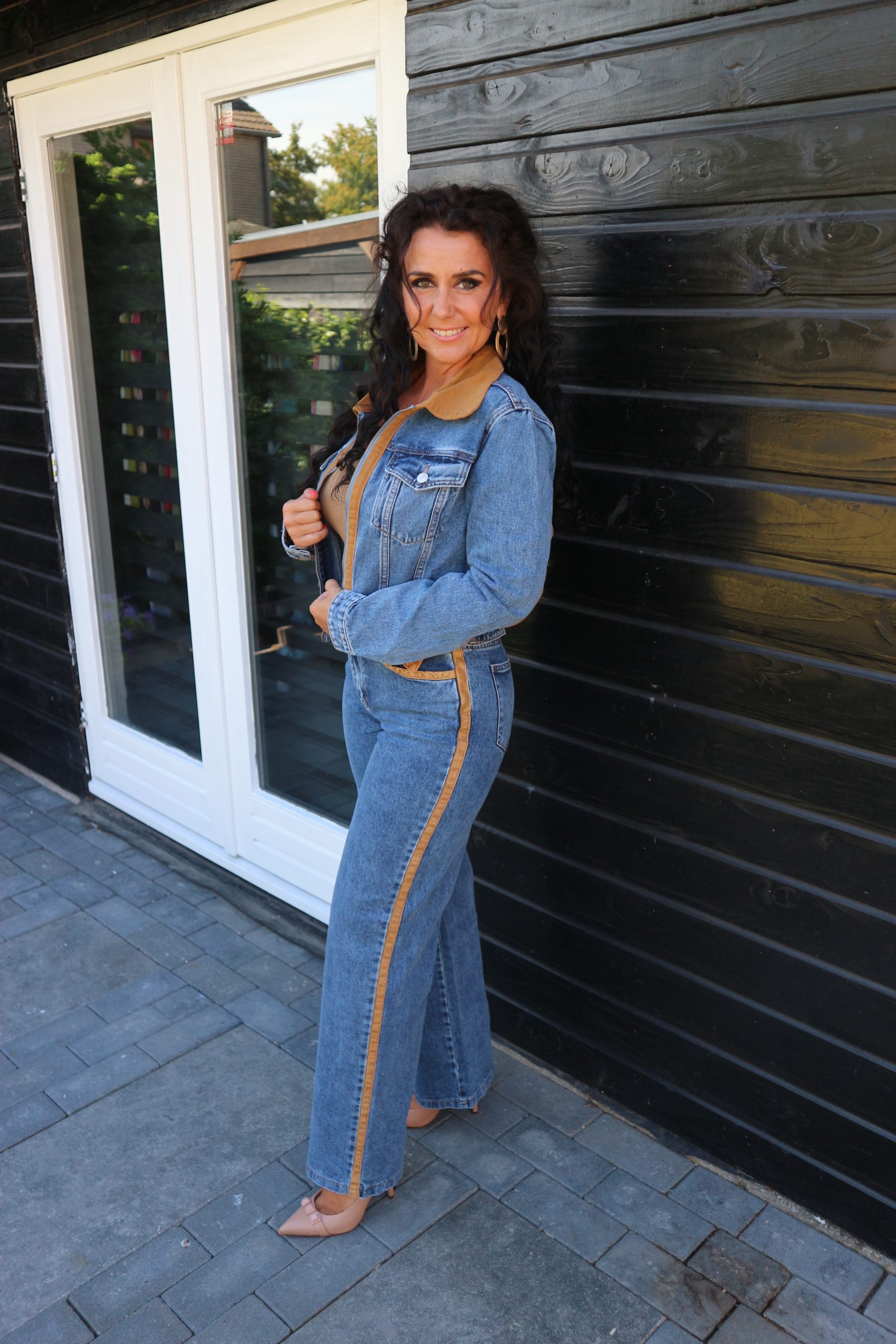 high waist stretch jeans met camel bies en bijpassend jasje