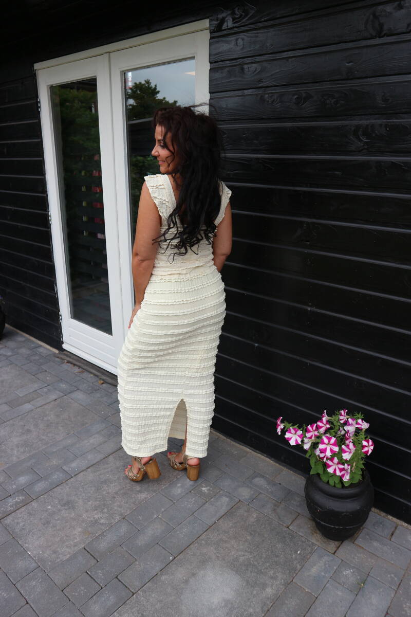 tweedelige ruffle stretch set bestaande uit een lange rok met split en een topje